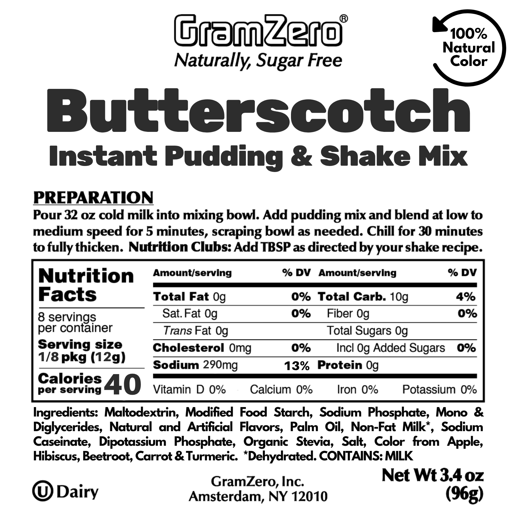 Butterscotch Natural Color Instant Pudding Mix Ingredients: Maltodextrin, Modified Food Starch, Sodium Phosphate, Mono & Diglycerides, Natural and Artificial Flavors, Palm Oil, Non-Fat Milk*, Sodium Caseinate, Dipotassium Phosphate, Organic Stevia, Salt, Color from Apple, Hibiscus, Beetroot, Carrot & Turmeric. *Dehydrated. CONTAINS: MILK