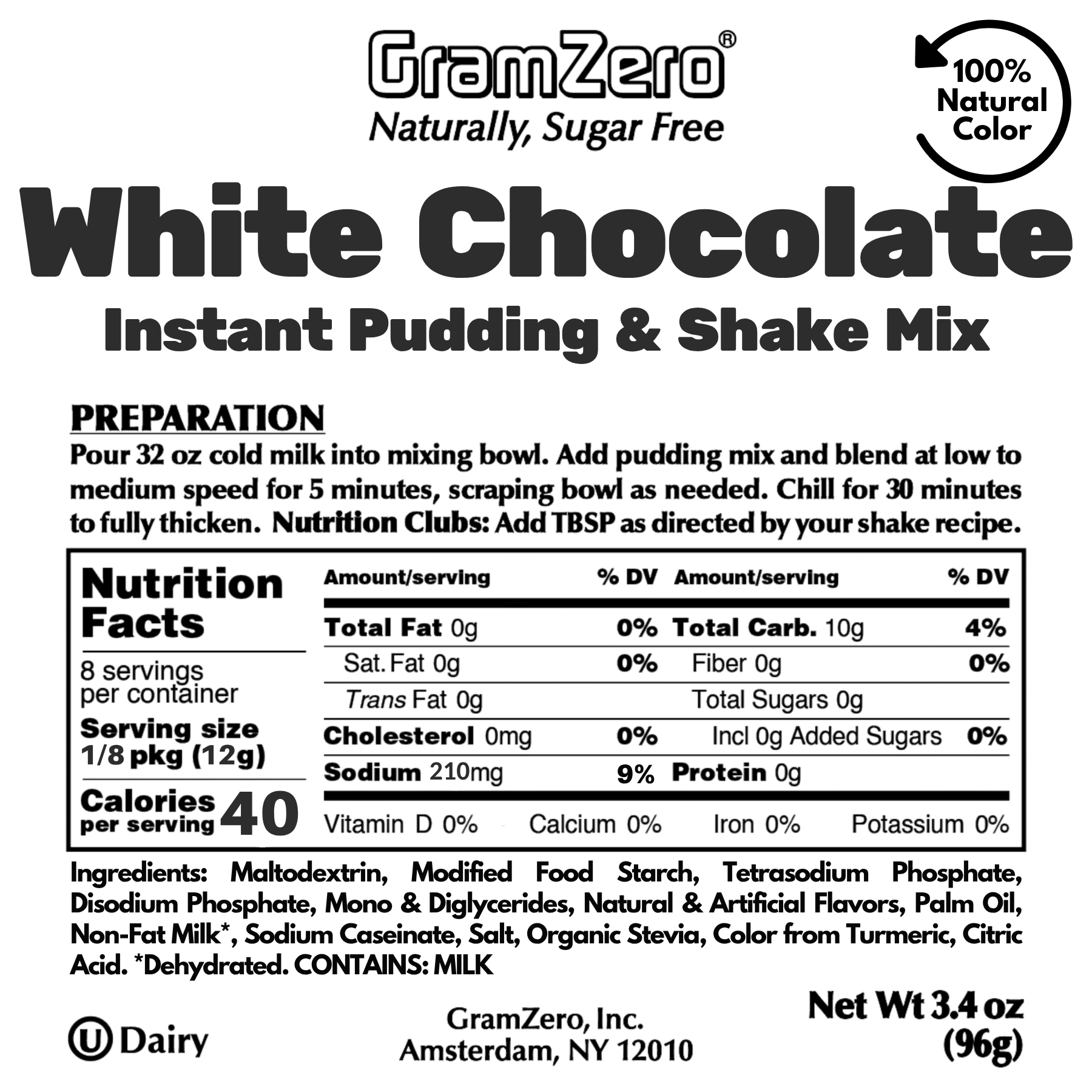 This 3.4 ounce pouch of Sugar Free Pudding Mix is a perfect size to sample GramZero's WHITE CHOCOLATE Flavor for Nutrition Club use as a Creamy Shake Mix Flavoring or as a Low Carb Pudding Dessert to enjoy at home!